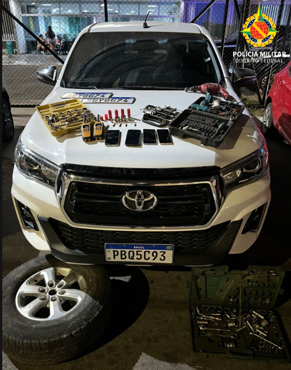 No local, os militares recuperaram uma Hilux furtada e apreenderam outros dois veículos, além de munições de diversos calibres (12, .44 Magnum e .17 HMR), acessórios de armas de fogo, kits de ferramentas utilizados para adulterar veículos, um par de placas furtadas, quatro celulares e R$ 1.250,50 em espécie.